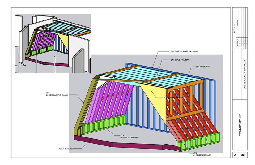 Engineered as a free-standing structure to minimize noise transfer, it was built in-house on a tight budget using partially reclaimed wood and climbing holds.